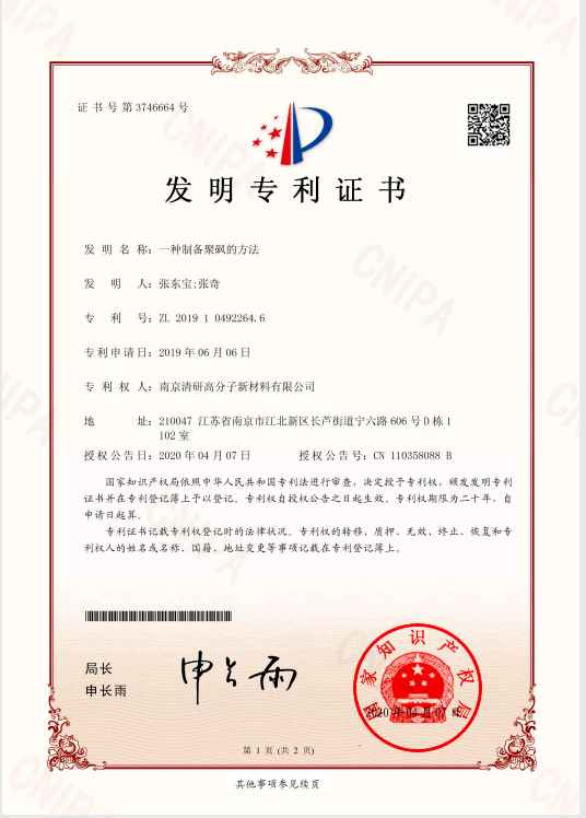 截至近日,我司及其全資子公司揚(yáng)州清研高分子新材料有限公司申報(bào)的:“一種制備聚砜的方法” 專利號(hào):ZL 2019 1 0492264.6,“一種制備聚醚醚酮樹脂的方法” 專利號(hào):ZL 2019 1 0563187.9和“一種制備聚醚砜的方法” 專利號(hào):ZL 2019 1 0506790.3共三項(xiàng)發(fā)明專利獲得國(guó)家知識(shí)產(chǎn)權(quán)局授權(quán)。此外,我司有六件實(shí)用新型專利獲得國(guó)家知識(shí)產(chǎn)權(quán)局授權(quán)。